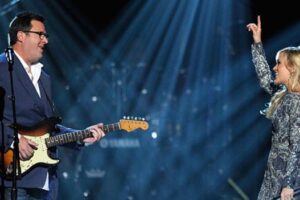Carrie Underwood stepped into the spotlight in a silver gown, the kind that catches light like stained glass in a country church. Beside her stood Vince Gill, quiet and steady,…