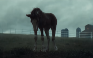 The foal steps closer to the fallen log where the eagle chick is struggling against the wind. Then — almost imperceptibly — it lowers its body.